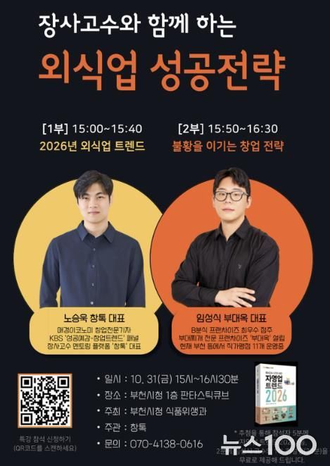 부천시는 이번 특강이 외식업 현장의 생생한 경험과 미래 전략을 동시에 얻는 기회가 될 것으로 보고 있다. 아울러 현장 참석자 중 추첨을 통해 ‘자영업 트렌드 2026(매경이코노미·창톡고수 지음)’ 신간 도서 5권을 증정하며, 임성식 대표의 무료 개인 맞춤 컨설팅도 함께 제공한다.