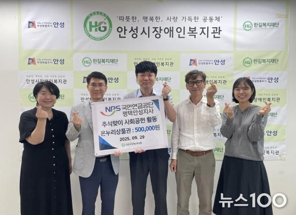 뉴스100 김동초 기자 | 사회복지법인 한길복지재단에서 수탁하고 있는 안성시장애인복지관은 지난 9월 29일 국민연금공단 평택안성지사로부터 사회공헌활동으로 50만원 상당의 온누리 상품권을 후원받았다고 밝혔다.