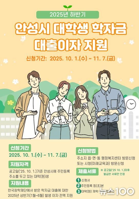 뉴스100 김동초 기자 | 안성시는 오는 10월 1일부터 11월 7일까지 ‘2025년도 하반기 안성시 대학생 학자금 대출이자’ 지원 신청을 받는다.