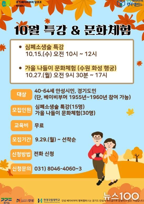 뉴스100 김동초 기자 | 안성 베이비부머 행복캠퍼스(한경국립대학교 평생교육원)는 오는 10월 15일부터 27일까지 중장년 안성시민(경기도민)을 대상으로 ‘10월 특강(심폐소생술) 및 문화체험(수원화성행궁)’ 프로그램을 운영한다고 밝혔다.