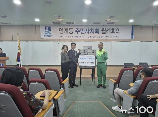 뉴스100 김동초 기자 | 수원시 팔달구 인계동 주민자치회는 지난 10월 1일, 가을철 관내 낙엽청소용 송풍기 벨트(100만 원 상당)를 인계동 행정복지센터에 전달했다.