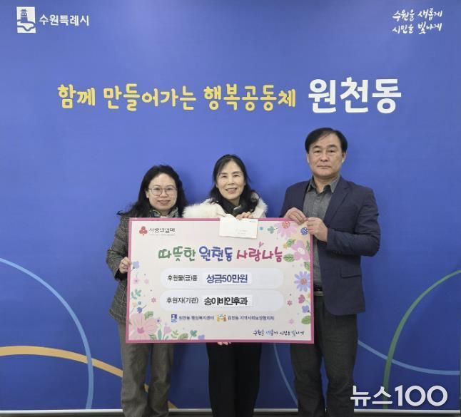 뉴스100 김동초 기자 | 지난 18일, 원천동에 소재한 송이비인후과는 지역사회 나눔 실천의 일환으로 원천동행정복지센터에 성금 50만 원을 기부했다.