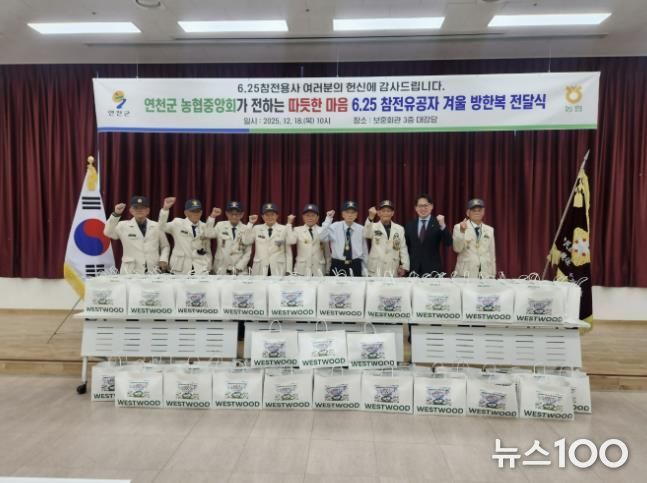 뉴스100 김동초 기자 | NH농협 연천군지부는 18일 연천군 보훈회관에서 연천 관내 6.25 참전유공자에 감사와 사랑의 마음을 담은 600만원 상당의 위문품(동절기 방한복)을 전달했다.