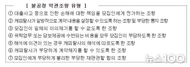뉴스100 김동초 기자 | 공정거래위원회는 8개 캐피탈사가 대출모집인과 체결하는 대출업무 위탁계약서상 약관을 심사하여 책임 전가 조항, 일방적 계약내용 설정 조항 및 일체의 이의제기 금지 조항 등 모집인에게 부당하게 불리한 7개 유형의 불공정 약관조항을 시정했다.