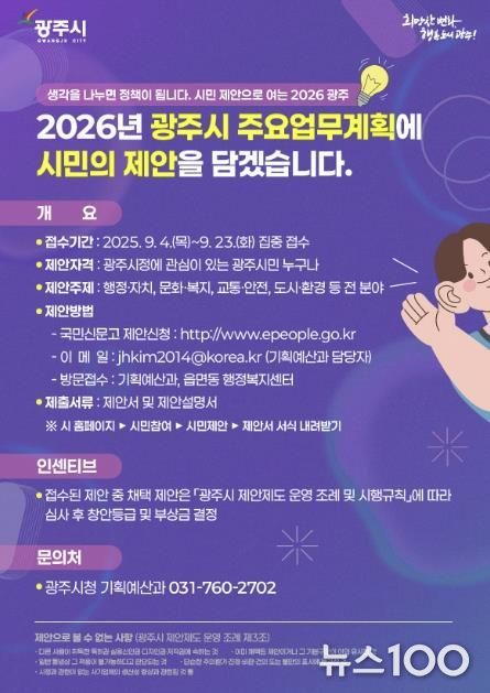 뉴스100 김동초 기자 | 광주시는 시민이 직접 제안한 아이디어를 반영해 2026년도 주요업무계획을 수립한다고 4일 밝혔다.