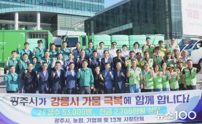 뉴스100 김동초 기자 | 광주시와 광주농협, 관내 기업체, 13개 민간사회단체는 최근 지속적인 가뭄으로 생활용수 확보에 어려움을 겪고 있는 강릉시에 2리터 생수 53,000병 18톤 트럭 4대 분량을 긴급 지원했다고 5일 밝혔다.