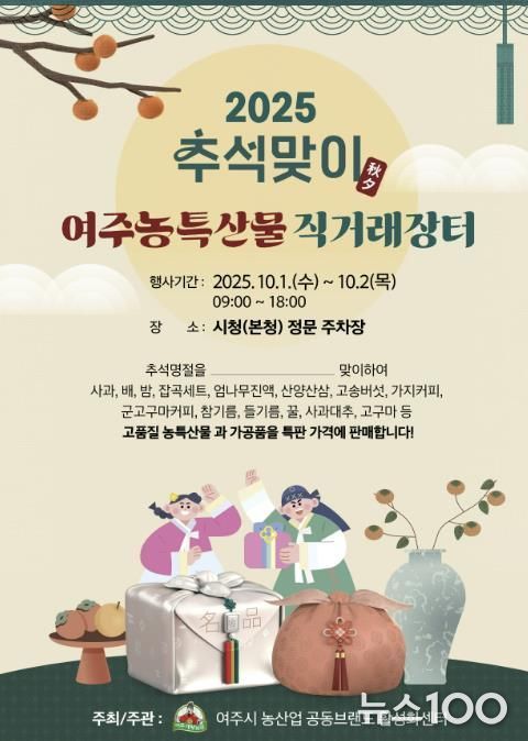 뉴스100 김동초 기자 | 여주시는 추석을 앞두고 오는 10월 1일부터 2일까지 이틀간 시청 정문 주차장에서 ‘2025년 추석 명절맞이 농산물 직거래장터’를 운영한다.