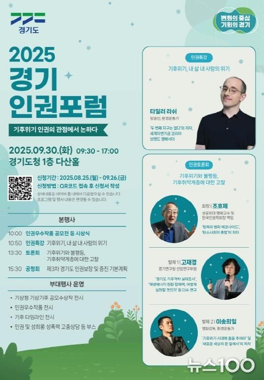 뉴스100 기자 | 경기도는 오는 30일 경기도청 다산홀에서 누구나 참여해 함께 소통할 수 있는 경기도 인권공동체 문화 확산 행사 ‘2025 경기인권포럼’을 개최한다.