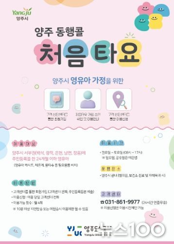뉴스100 김동초 기자 | 양주시가 오는 10월 20일부터 읍·면 지역 24개월 이하 영유아를 동반한 보호자 이동지원차량 ‘처음타요’를 시범 운영한다.