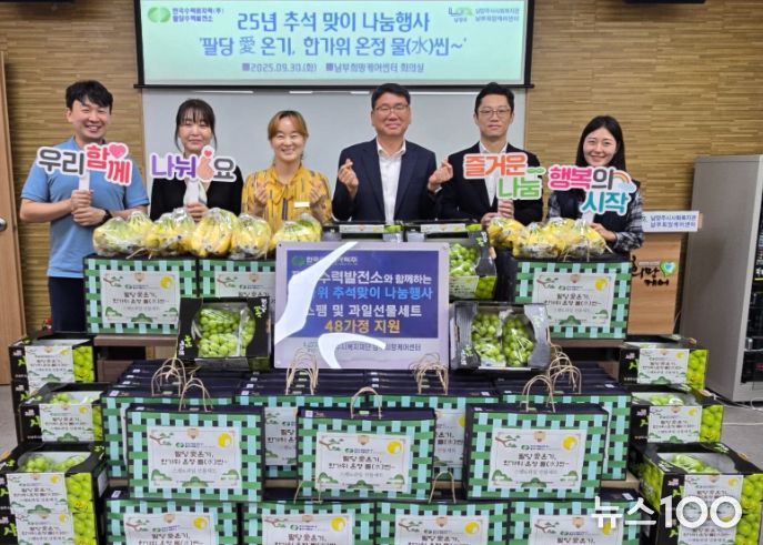 뉴스100 김동초 기자 | 남양주시는 9월 30일 남부희망케어센터가 한국수력원자력(주)팔당수력발전소의 후원을 받아 ‘팔당愛 온기, 한가위 온정 물(水)씬~’이라는 이름으로 2025년 추석 명절맞이 나눔행사를 진행했다고 밝혔다.