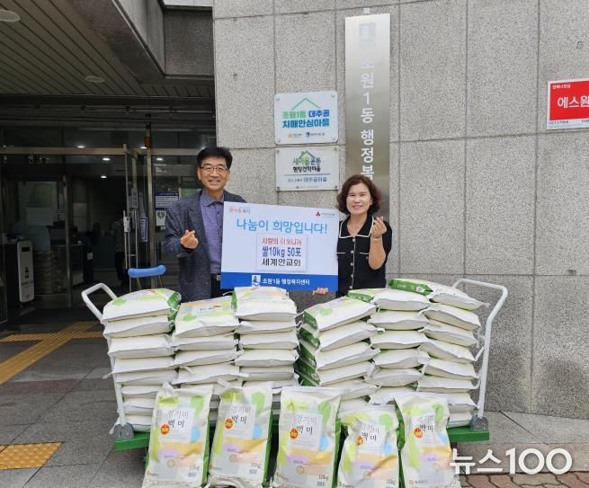 뉴스100 김동초 기자 | 수원시 장안구 조원1동 대한예수교장로회 세계인교회는 지난 1일, 추석 명절을 맞이하여 조원1동 행정복지센터에 백미10kg 50포를 전달했다.