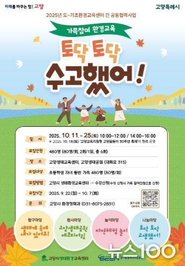 뉴스100 김동초 기자 | 고양특례시는 가족과 함께 참여하는 환경교육 프로그램‘토닥 토닥 수고했어!’를 오는 11일부터 25일까지 매주 토요일 고양생태교육센터와 고양생태공원에서 운영한다고 밝혔다.