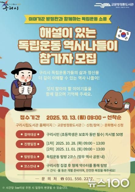 뉴스100 김동초 기자 | 구리시는 오는 10월 13일부터 27일까지 교문 방정환 도서관에서 진행하는 ‘해설이 있는 독립운동 역사 나들이’ 프로그램의 참여자를 모집한다고 밝혔다.