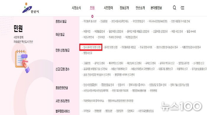 뉴스100 김동초 기자 | 안산시는 지난 13일부터 ‘국민신문고’ 시스템 장애에 대응해 안산시청 누리집에 ‘임시 온라인 민원 신청’ 창구를 설치하고 운영을 시작했다고 14일 밝혔다.
