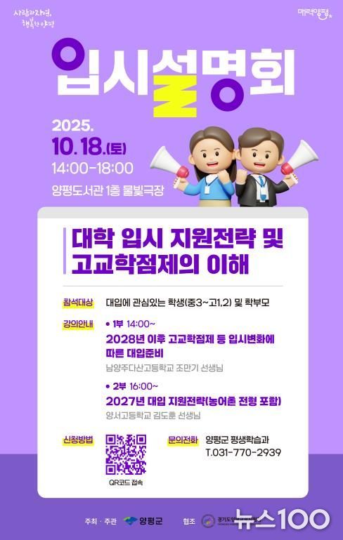 뉴스100 김동초 기자 | 양평군은 오는 10월 18일 오후 2시, 양평도서관 물빛극장에서 관내 학생과 학부모를 대상으로 ‘2025년 양평군 대학 입시설명회’를 개최한다고 밝혔다. 이번 설명회는 대학 입시에 관심 있는 학생과 학부모에게 다양한 입시 정보를 제공하기 위해 마련됐다.