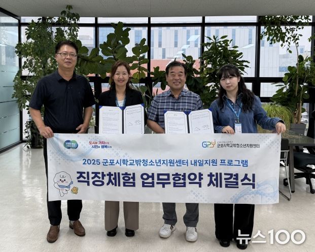 뉴스100 김동초 기자 | 군포시청소년재단(대표이사 김덕희), 군포시학교밖청소년지원센터(센터장 강연미)는 시각디자인 분야로의 진학과 진로를 희망하는 학교 밖 청소년을 지원하기 위해 관내 디자인 전문업체인 ㈜은진과 직장체험 업무협약을 체결했다고 밝혔다.