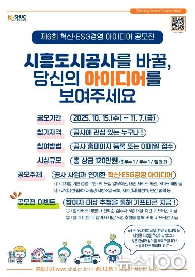 뉴스100 김동초 기자 | 시흥도시공사는 10월 15일부터 11월 7일까지 ‘제6회 시흥도시공사 혁신·ESG경영 아이디어 공모전’을 개최한다.