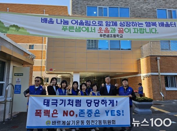 뉴스100 김동초 기자 | 양주시 바르게살기운동 회천2동위원회(위원장 황영학)가 16일 푸른샘초등학교 앞에서 학생들을 대상으로 학교폭력 예방 캠페인을 실시했다.