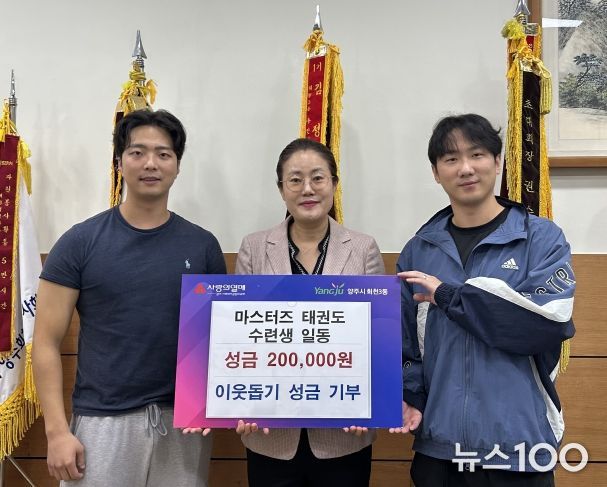 뉴스100 김동초 기자 | 양주시 회천3동(동장 조전희)이 16일 마스터즈태권도(공동대표 구자환·배재용)에서 행정복지센터를 방문해 어린 수련생들의 정성이 담긴 성금을 전달하고 기부식을 진행했다고 밝혔다.