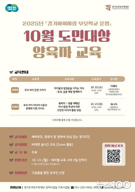 한편 이번 교육은 재단이 경기도 위탁으로 운영하는 ‘2025년 경기아이사랑부모학교’ 사업의 하나로 마련됐다. ‘경기아이사랑부모학교’는 경기도가 건강한 양육 문화 확산을 목표로 도민에게 체계적인 양육자 교육과 1:1 맞춤형 양육상담을 제공하는 사업이다.
