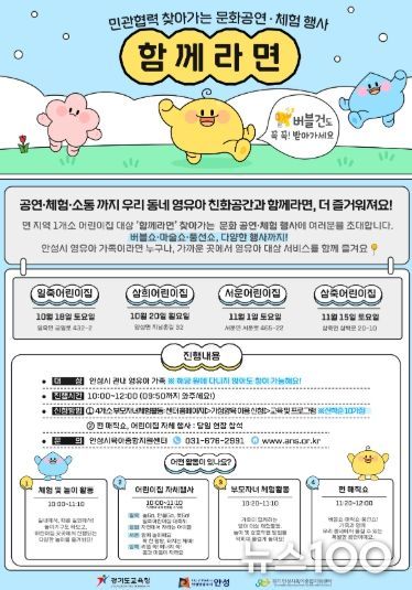 뉴스100 김동초 기자 | 안성시육아종합지원센터는 오는 10월 18일부터 11월 15일까지 면지역 어린이집을 거점으로 영유아 가족을 대상으로 한 찾아가는 육아지원 프로그램 ‘함께라면(面)’을 운영한다고 밝혔다.