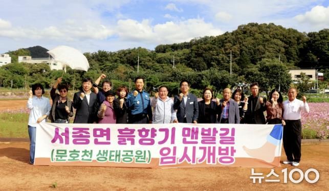 뉴스100 김동초 기자 | 양평군 서종면은 지난 17일 오후 1시, 서종면 문호리 968 일대 문호천 생태공원에서 ‘서종면 흙향기 맨발길’ 임시 운영을 기념하는 걷기 행사를 개최했다.