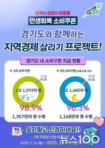 한편 경기도의 지난 1차 소비쿠폰의 지급률은 98.9%로 1,357만여 명이 소비쿠폰 2조 1,593억 원을 수령한 바 있으며, 26일 현재 1차와 2차를 거쳐 지급된 소비쿠폰(약 3조 3,275억 원)의 91.5%가 사용된 것으로 나타났다.
