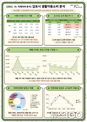 뉴스100 김동초 기자 | 김포시는 지난 10월 27일 확대간부회의를 통해 2025년 생활이동소비 데이터를 바탕으로 한 공공빅데이터 분석을 실시했다고 밝혔다. 이번 분석은 생활인구이동, 가맹점 매출, 소비금액 등 다양한 지표를 종합적으로 검토해 이루어졌다.