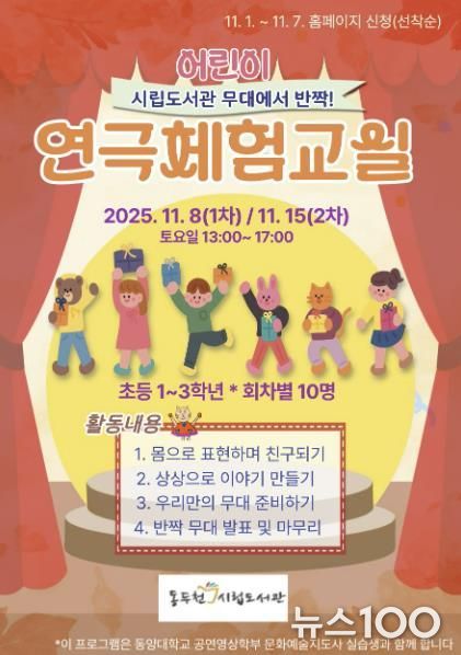 뉴스100 김동초 기자 | 동두천시 도서문화사업소 남산모루 작은도서관은 오는 11월 11일과 18일 두 차례 오후 1시부터 5시까지 초등학교 저학년(8~10세)을 대상으로 ‘무대 위에서 반짝! 나를 발견해요’ 연극체험교실을 운영한다.