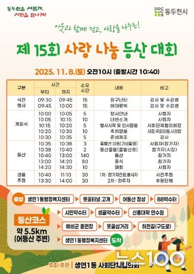 뉴스100 김동초 기자 | 동두천시 생연1동 사회단체협의회는 오는 8일 시민이 함께하는 ‘제15회 사랑나눔 등산대회’를 개최한다고 밝혔다.