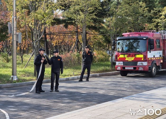 뉴스100 김동초 기자 | 경기도교육청이 4일 북부청사에서 의정부소방서 금오119안전센터와 함께 합동 소방훈련을 실시했다.