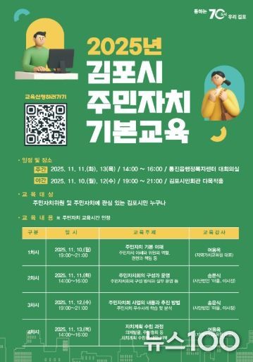 뉴스100 김동초 기자 | 김포시는 주민자치위원 및 주민자치에 관심 있는 시민을 대상으로 '2025년 김포시 주민자치 기본 교육'을 오는 11월 10일부터 13일까지 운영한다고 밝혔다.