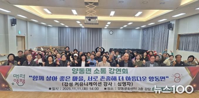 뉴스100 김동초 기자 | 양평군 양동면은 11일 오후 2시 양동문화센터 3층 대강당에서 ‘함께 살아 좋은 마을, 서로 존중해 더 아름다운 양동면’을 주제로 소통강연회를 개최했다.