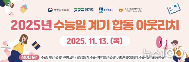 뉴스100 김동초 기자 | (재)수원시청소년청년재단 수원여자단기청소년쉼터는 11월 13일 오후4시부터 8시까지 수원역 일대(수원역 로데오 문화광장, 수원역 7번,12번 출구)에서 청소년들이 안전하고 건강하게 성장할 수 있는 지역사회를 만들기 위해 수원여자단기청소년쉼터 주관, 수원시 시민협력교육국, 경기남부경찰청, 팔달경찰서, 수원시청소년성문화센터, 수원시상담복지센터, 수원시학교밖청소년지원센터, 수원시청청마음건강센터, 수원남자단기청소년쉼터 총 9개의 기관이 참여하는‘수능 맞이 합동 아웃리치’로 진행한다.
