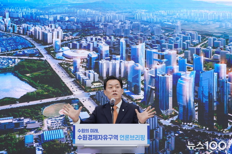 사진3) 이재준 수원특례시장이 지난 6월 수원 경제자유구역 언론브리핑을 열고 지정을 위해 노력하겠다고 설명하고 있다.
