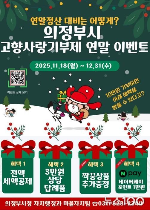 뉴스100 김동초 기자 | 의정부시는 연말을 맞아 고향사랑기부제 참여를 확대하기 위해 다양한 혜택을 제공하는 ‘고향사랑기부제 연말 이벤트’를 진행한다.