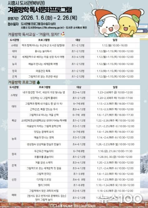 뉴스100 김동초 기자 | 시흥시는 겨울방학을 맞아 북부권 8개 공공도서관(소래빛ㆍ대야ㆍ목감ㆍ능곡ㆍ장곡ㆍ은계ㆍ신천ㆍ매화)에서 1월 6일부터 2월 26일까지 겨울독서교실 및 겨울방학 프로그램을 운영한다.