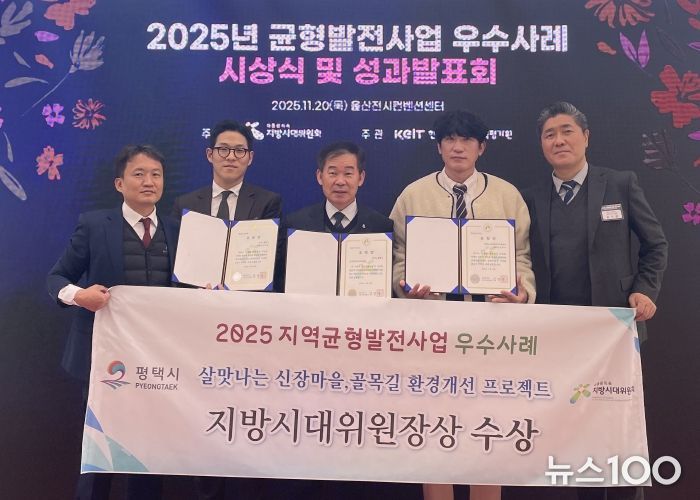 뉴스100 김동초 기자 | 평택시는 『2025년 균형발전사업 우수사례 시상식』의 균형발전사업평가 부문 우수기관으로 선정되어, 지난 20일 열린 ‘2025 지역균형발전사업 우수사례 시상식’에서 지방시대위원장상 기관 표창을 받았다.