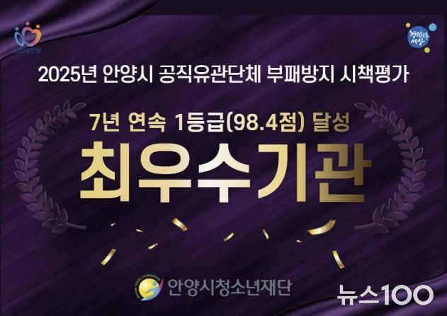 뉴스100 김동초 기자 | 안양시청소년재단이 2025년 안양시 공직유관단체 부패방지 시책평가에서 7년 연속 최우수기관으로 선정됐다. 재단은 이번 평가에서 총점 98.4점이라는 높은 점수를 획득하며, 안양시 7개 공직유관단체 중 최고 수준의 청렴도와 투명성을 다시 한번 입증했다.