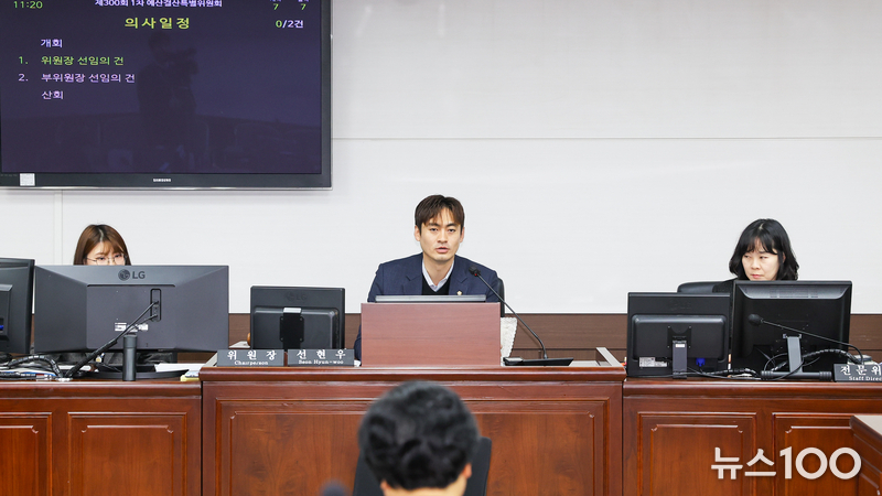 사진2 설명: 24일 열린 제300회 제2차 정례회 제1차 예산결산특별위원회에서 위원장으로 선출된 선현우 의원(가운데)의 모습.