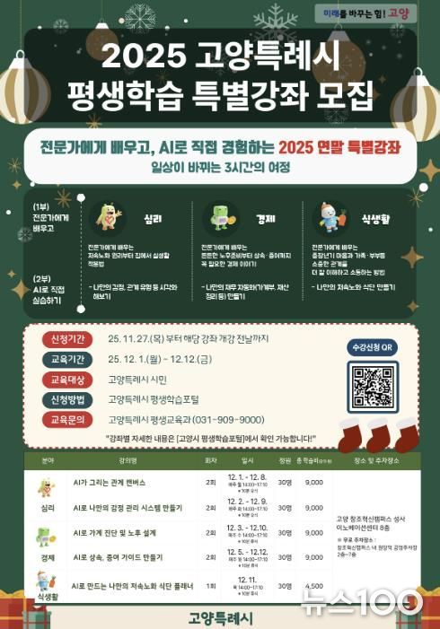 뉴스100 김동초 기자 | 고양특례시는 지난 상반기부터 진행된 평생학습 시민강좌가 시민들의 큰 호응을 얻은 데 힘입어 12월 1일 2025년을 마무리할 특별강좌를 운영한다고 밝혔다.