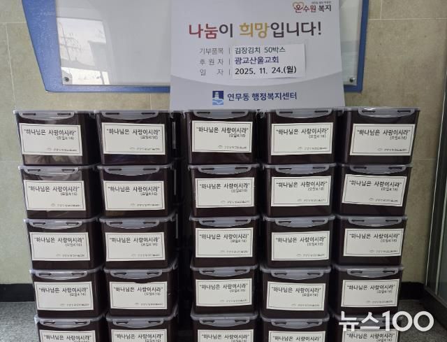 공순정 연무동장은 “추운 겨울을 앞두고 따뜻한 정성을 담아 김장김치를 기부해주신 광교산울교회에 깊이 감사드린다”며 “기부해주신 김치는 꼭 필요한 이웃들에게 소중히 전달하겠다”고 전했다.