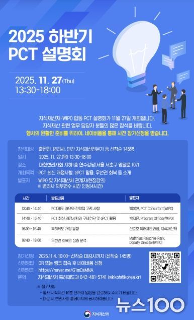 뉴스100 김동초 기자 | 지식재산처는 세계지식재산기구(WIPO)와 공동으로 11월 27일 13시 30분 대한변리사회(서울시 서초구) 연수강당에서 2025년 하반기 특허협력조약* 국제출원 설명회를 개최한다. 이번 설명회는 특허협력조약 제도의 최신 개정 동향과 전략적 활용방안을 공유하기 위해 마련됐으며, WIPO 담당자들이 직접 참석해 대면 설명회를 진행한다.