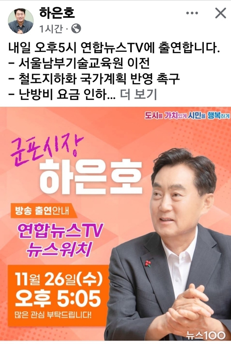 하은호 군포시장 27일 오후5시 연합뉴스 TV출연/서울남부 기술교육원이전, 철도지하화 국가계획반영촉구, 난방비 요금인하 외 정책발표