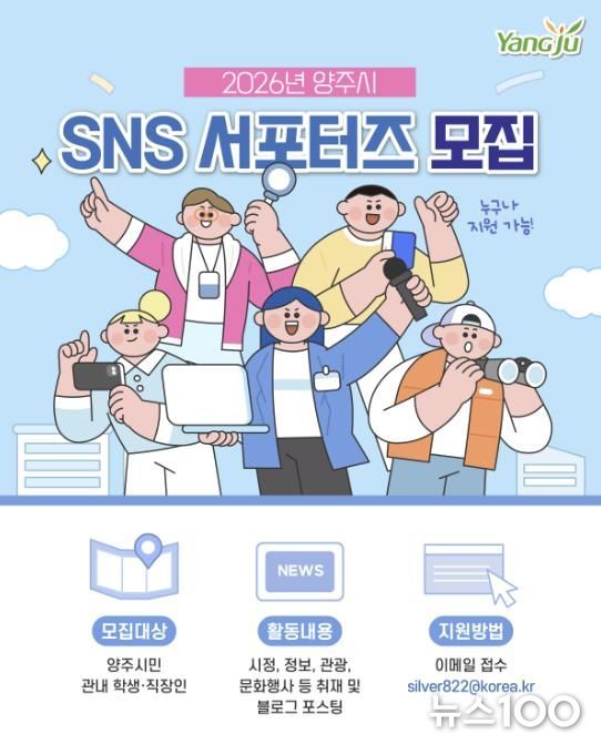 뉴스100 김동초 기자 | 양주시가 시민과 소통하며 시정 소식과 지역의 숨은 매력을 널리 알릴 '2026년 양주시 SNS 서포터즈'를 오는 12월 1일부터 10일까지 10일간 모집한다.