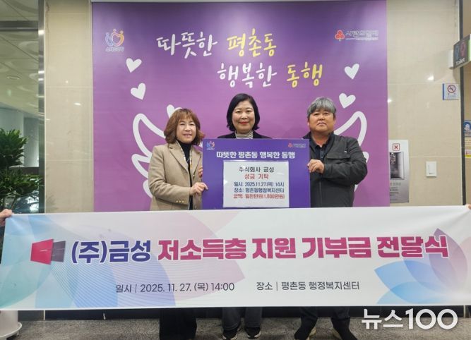 뉴스100 김동초 기자 | 안양시 동안구 평촌동 행정복지센터는 관내 건설자재 제조업체인 ㈜금성이 지난 27일 관내 어려운 이웃을 위해 사용해달라며 성금 1천만원을 센터에 기탁했다고 28일 밝혔다.