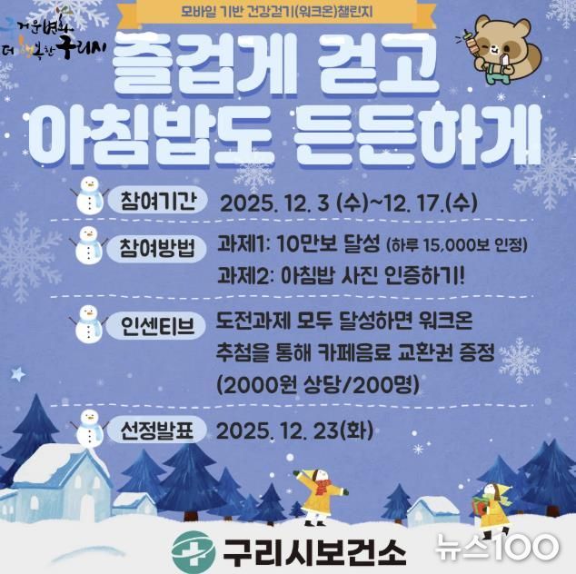 뉴스100 김동초 기자 | 구리시는 시민들의 건강한 생활 습관 형성을 위해 ‘즐겁게 걷고, 아침밥도 든든하게’ 챌린지를 오는 12월 3일부터 17일까지 15일간 운영한다고 밝혔다.