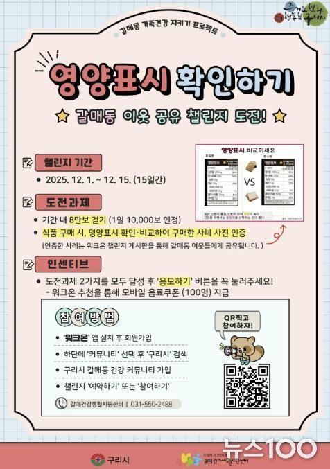 뉴스100 김동초 기자 | 구리시 갈매건강생활지원센터는 12월 1일부터 12월 15일까지, 15일간 갈매동 주민의 올바른 식품 선택을 돕기 위한 ‘영양표시 확인하기’ 갈매동 이웃 공유 챌린지를 운영한다고 밝혔다.