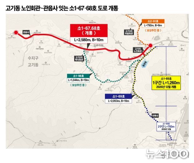 뉴스100 김동초 기자 | 용인특례시는 지난 11월 30일 수지구 고기동 노인회관에서 관음사까지 이어지는 도시계획도로 소1-67·68호선(연장 2.58km)을 개통했다고 1일 밝혔다.