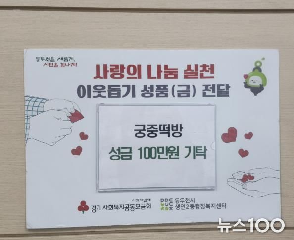 뉴스100 김동초 기자 | 동두천시 생연2동 궁중떡방은 겨울철 취약계층의 생활 안정을 위해 사용해 달라며 성금 100만 원을 기부했다.